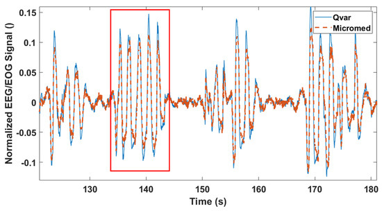 One of the main artifacts of frontal channel EEG is the electrooculogram [41,42]. Despite being a high-amplitude artifact in EEG recordings, EOG is a useful signal for many applications [43] and diagnoses [44] because it allows to detect eye movements. One of the main applications of EOG regards the classification of sleep stages through the evaluation of several physiological variables, including eye movements [45]. More in detail, to identify the so-called “rapid eye movement (REM) sleep”, it is necessary to record a random rapid movement of the eyes in a range of directions. Accordingly, our test features clockwise eye movements to verify the ability of our system to recognize multidirectional eye movements by EOG signals. Following the International 10–20 System Standard [46], electrode positioning in the Fp1 and Fp2 locations allows recording the EOG. MicroMed electrodes were also placed in Fp1 and Fp2 configuration, very close to the ST-Qvar ones. The subject was asked to rotate eyes (closed) clockwise for some seconds, then to pause and repeat this protocol four times. Results are shown in Figure 17. High-amplitude oscillations (highlighted with a red continuous rectangle) represent eye movements and can be easily recognized with respect to the background. After the eye movements, the subject was also asked to blink their eyes repeatedly. This test is shown in Figure 18. Even in this case, the signals from ST-Qvar and the gold standard perfectly overlap. All these elements point to the accuracy of the ST-Qvar recordings with respect to the gold standard, significantly supporting the feasibility of charge variation technology for biopotentials acquisition.