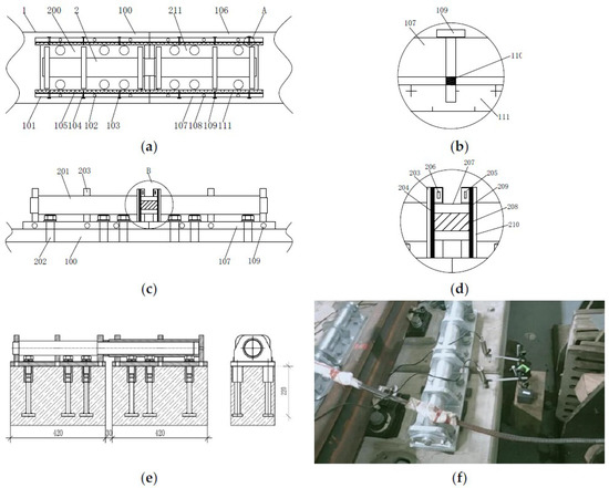 The design schematic of the combined shear hinge and the site are shown in Figure 2. When the shear hinge device is in use, the first shear hinge clamping plate 105 and the second shear hinge clamping plate 111 are moved to the top of the first floating slab 100 by the first adjusting bolt 103 and the second adjusting bolt 109. The shear hinge 201 is placed in front of the first floating slab 100 and the second floating slab 106, and the first shear hinge base 200 is threadedly connected to the first floating slab 100 through fixing bolts 202. The first adjusting bolt 103 is adjusted to make the first shear hinge clamping plate 105 contact and clamp the first shear hinge base 200, which effectively prevents the shear hinge 201 from breaking due to loosening of the fixing bolts 202 in front of the first shear hinge base 200. The movable baffle 205 is taken out through the baffle connecting block 206, and the first connecting plate 204 and the second connecting plate 209 are put into the interior of the first shear hinge support 203 and the second shear hinge support 210, where the damping sleeve 207 and the spring 208 can achieve a certain buffering effect. After the placement is completed, the movable baffle 205 is reset, so that the staff can replace the damping sleeve 207 and the shear hinge 201 at any time. The second shear hinge base 211 is fixed to the front of the second floating slab 106 by the fixing bolts 202, the second adjusting bolts 109 are adjusted; when the second shear hinge clamping plate 111 is brought into contact with the second shear hinge base 211 and clamped, the installation work of the device can be completed [18].