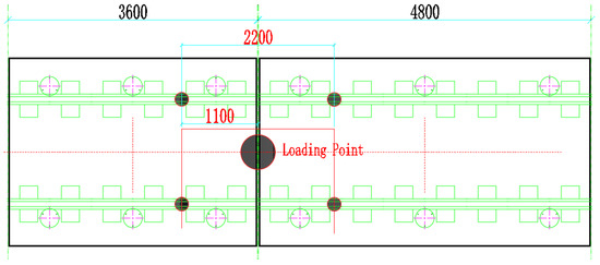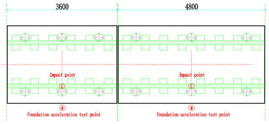 Since the function of the shear hinge is the same under different settings, it provides the establishment of longitudinal shear force constraints for the end of the track slab, and the end conditions of different track slabs are similar. In order to study the vibration-damping performance of the track slabs with two lengths at the same time, under the same experimental cost and conditions, 3.6 m + 4.8 m is the best experimental plan. To fully explore the damping performance of SSFST, the acceleration at the ground foundation is mainly collected. Therefore, the acceleration sensors are arranged on the foundation of the track slab, and the frequency response characteristics of the foundation under different working conditions are explored through the comparative analysis of the acceleration at the foundation of each track. In the test, the drop hammer impact test is mainly performed on two types of track slabs. When arranging the acceleration measuring points, the 0.5 g acceleration sensor is mainly arranged on the ground in the middle of the SSFST, as shown in Figure 6.