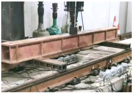 The schematic diagram of the test system is shown in Figure 4, and the field of the loading device is shown in Figure 5. During the fatigue load test, the rail is pressed by the force adding frame. Load value 80 kN < P < 308 kN, number of cycles N1 = 5 × 106, N2 = 1 × 107, and the load frequency is 3 Hz. The reason is that the axle load of Chinese subway type B car is 14 t [19], and one bogie has two axles (weight is 28 t), and then multiplied by the safety factor of 1.1, so the upper limit of the fatigue load is taken as 28 × 10 × 1.1 = 308 kN. The lower limit of fatigue load = upper limit × 0.25, so on the basis of 308 kN, 308 × 0.25 = 77 kN, taking a multiple of 10 kN is 80 kN. The length of Chinese subway type B car is 12.6 m, each car has 2 bogies, and the actual running speed of the train is generally 70 km/h (19.44 m/s), so in the average time interval of 12.6/(2 × 19.44) = 0.324 s, the track slab will pass a bogie load, which is about 3 Hz. Therefore, the fatigue load value in this study can simulate the real train load well and has reliability.