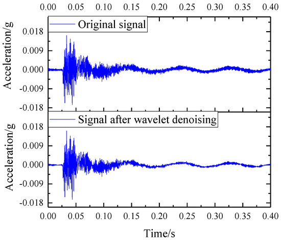 Take the acceleration data of the measuring point at the foundation after the vibration isolator is installed at 3.6 m SSFST as an example, as shown in Figure 7. After reconstructing the decomposed signal, it can be seen that the overall waveform of the signal after denoising has not changed much, but the clutter of the signal has been significantly reduced; as shown in Figure 8, 0~0.03 s and 0.17~0.30 s are the most significant, indicating that the wavelet soft threshold denoising is suitable for this type of signal processing. After clutter processing, it will be more conducive to subsequent analysis.
