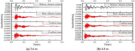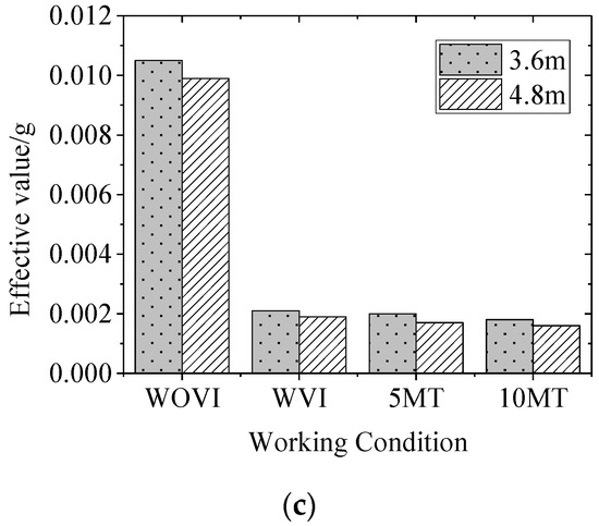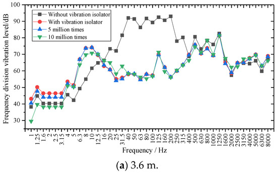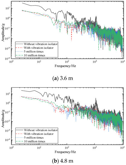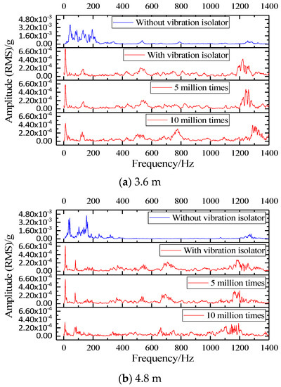 According to Figure 12a, when the vibration isolator is not installed, the amplitude spectrum (RMS) of 3.6 m SSFST has 7 obvious peak points, located at 44.99 Hz, 89.98 Hz, 132.48 Hz, 194.98 Hz, 534.93 Hz, 789.91 Hz, and 1254.84 Hz, and their RMS is 37.28 × 10−4 g, 27.27 × 10−4 g, 27.12 × 10−4 g, 28.73 × 10−4 g, 6.79 × 10−4 g, 4.19 × 10−4 g, and 6.54 × 10−4 g, respectively. After installing the vibration isolator, the amplitude spectrum (RMS) has four obvious peak points, located at 10.50 Hz, 134.98 Hz, 524.93 Hz, and 1222.35 Hz, its RMS is 7.31 × 10−4 g, 1.91 × 10−4 g, 2.23 × 10−4 g, and 6.49 × 10−4 g, respectively. After 5 million fatigue loads, the positions and amplitudes of the above four peak points have relatively small changes, which are located at 10.25 Hz, 132.48 Hz, 542.43 Hz, and 1243.34 Hz, respectively, and its RMS is 6.34 × 10−4 g, 1.91 × 10−4 g, 2.30 × 10−4 g, and 5.16 × 10−4 g. The peak point and amplitude of 10 million times of fatigue change greatly, and another peak point appears at 777.41 Hz; all peak points are located at 10.498 Hz, 127.42 Hz, 504.43 Hz, 777.41 Hz, and 1287.34 Hz, respectively, and its RMS is 4.74 × 10−4 g, 2.49 × 10−4 g, 1.94 × 10−4 g, and 4.25 × 10−4 g, respectively.