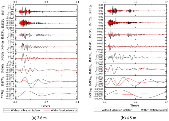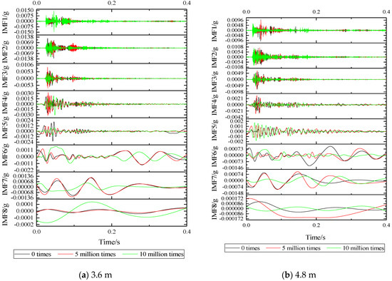 According to the characteristics of IMF, for the vibration acceleration at the foundation of SSFST of non-stationary signal, EMD can be used for analysis and processing to obtain the IMF of each frequency band. Through the energy intensity under the characteristic scale reflected by IMF, as shown in the impact intensity of the vibration acceleration signal in each frequency band, it is used to compare the vibration acceleration signal of the foundation under different vibration isolators and fatigue conditions [33].