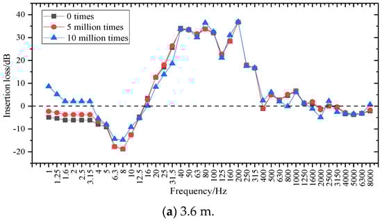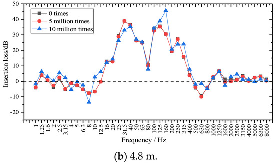 In order to study the effect of fatigue on the insertion loss of steel spring isolators, the fatigue loss of two SSFSTs was plotted as a function of fatigue load, as shown in Figure 18. It can be seen that in the range of 1~200 Hz, the vibration isolation effect of the vibration isolator on the foundation vibration is mainly reflected in the 16~400 Hz range. This phenomenon is consistent with the results in Section 3.2, that is, the vibration damping of the steel spring vibration isolator is mainly reflected in low frequency. At the same time, the insertion loss of the base frequency in the 5~16 Hz range is negative, indicating that the vibration in this frequency range is intensified, which is consistent with the conclusion that the maximum amplitude appears around 10 Hz after the isolator is installed in the analysis results of the amplitude spectrum (RMS). With the increase of fatigue load, the vibration isolator has a certain fluctuation in the insertion loss of the foundation at different frequency bands, but the variation amplitude is limited.