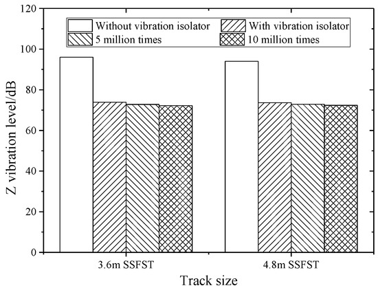 The Z vibration levels (VLz) at different track structure components of the two SSFSTs are shown in Table 7 and Figure 19. It can be seen that during the drop hammer impact, when weighing according to ISO2631-1:1985 [38], the spring vibration isolator’s foundation VLz gradually decreases before and after installation, after 5 million fatigue tests, and after 10 million fatigue tests. The Z vibration level results of the two sizes of SSFST are similar, and it can be seen that the increase in fatigue load will not weaken the vibration-damping effect of SSFST. The relevant literature [39] shows that the load caused by the operation of the subway line in one year is equivalent to 2 million fatigue loads. In this experiment, the vibration-damping effect changes little after 5 million and 10 million times, which just proves that the floating slab track can still guarantee a good vibration-damping effect after about 2.5 years and 5 years, which shows that the track structure has high reliability and has a shelf life of vibration-damping effect about 5 years.
