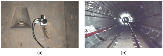 Field test diagram. (a) Acceleration measuring point of tunnel wall. (b) Overall view.