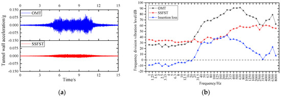 Comparison of vertical vibration of tunnel wall. (a) Acceleration time domain curve. (b) Frequency division vibration level and insertion loss.