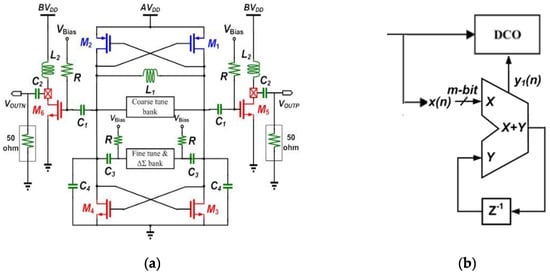 The classical single-loop PLL of spur reduction [,,] is published, which consists of a phase/frequency detector (PFD), a charge pump (CP), a loop filter (LF), a voltage controlled oscillator (VCO), and a frequency divider. The reference of [] calibration method accomplishes efficient search for an optimum VCO discrete tuning curve among a group of frequency sub-bands. The agility is attributed to a proposed frequency comparison technique which is based on measuring the period difference between two signals. To maintain phase-noise optimization and loop stability over the entire output frequency range, techniques of constant loop bandwidth are proposed []. The proposed prototype composes of a frequency detector (FD), a phase detector (PD), a digital loop filter (DLF), a DCO, a differential to single-ended (D to S) circuit, a first-order delta-sigma modulator (DSM) and frequency dividers in the feedback path as shown in Figure 1b []. The proposed prototype composes of two loops, the frequency detection loop, and the phase detection loop, respectively. The former has a low resolution to perform a coarse tuning and reduce the locking time for wide tuning range operation. The latter has a high resolution to implement fine tuning. In order to upgrade the DCO resolution, a first-order DSM is used. The DCO output is connected to the current-mode logic (CML) divider to lower the frequency and connected to the D to S circuit and other dividers. When the divide ratio by a multi-modulus divider (MMD) is changed, the frequency synthesizer can obtain different frequency bands. The locked output frequency fDCO is expressed as below: