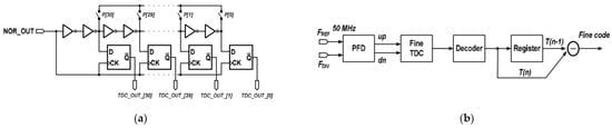 The proposed structure of the PD composes of a PFD, a fine TDC which has high resolution, a decoder and a register, as shown in Figure 4b. The phase difference between the FREF and the FDIV is detected at PFD, then the outputs of the PFD are inserted to the fine TDC. The register is used for storing the previous phase information and compares it and the current phase information. In an ADPLL, the phase error is executed by the TDC, and the phase error information is sent to the digital loop filter to control the DCO of each reference clock. When phase error is detected then updates DCO control codes at each reference clock period, the reference spur will take place. The proposed PD compares current and previous phase error information, and reduces the updating frequency of the DCO control codes and thereby reduces the reference spur. The delay chain of fine TDC is shown in Figure 5a. The leading clock is delivered to the delay chain, and the lagging clock is delivered to the D-type flip flop. The leading clock will be sampled by the lagging clock, then the phase difference of the leading and lagging clock will be digitized and quantified. The delay time of one inverter is the resolution of the fine TDC, which is about 32 ps. In order to cover the coarse TDC resolution, the stages of the fine TDC should not be less than 11, therefore, a 4-bit fine TDC is implemented in this design. Figure 5b illustrates the fine TDC structure []. There are two delay chains in the fine TDC; one where the leading clock is connected to the PFD output signal up, and the other one where the leading clock is connected to the PFD output signal dn. As the leading clock will be sampled by the lagging clock, a signal Sign_OUT is used to select the correct side and ensure the accuracy of the fine TDC output.