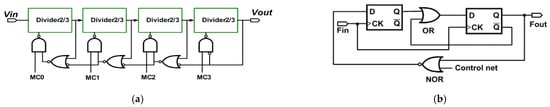 The promoted divider loop consists of a CML divider, a differential to single circuit, a true single-phase clock (TSPC) divider and a MMD to achieve the divide ratio 104, as shown in Figure 6b []. The CML divider circuit is used to handle the higher frequency of the VCO [,] output signal and produces divide-by-2 signal. The circuit of differential to single-ended sends the output signal of CML to the TSPC divider, and then produces the divide-by-2. Finally, the signal sends to the MMD, and outputs the divide-by-26 feedback signal. The programmable MMD is used to produce the different frequency band of the frequency synthesizer. The programmable MMD circuit contains 2/3 divider and a logic gate as shown in Figure 7a []. The MMD has the ability to treat frequency division over a wide continuous range. The 16-modulus divider is used to support all integer divided ratios from 16 to 31 in this design. The divide ratio of MMD can be defined as (6). As the input frequency of MMD is 1.3 GHz, the divided ratio must be 26.