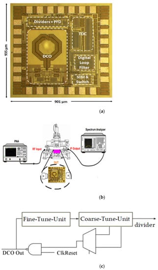 - Huang, J.-F.; Lai, W.-C.; Wen, J.-Y.; Mao, C.-C. Chip Design of 10 GHz Low Phase Noise and Small Chip Area PLL. In Proceedings of the 8th International Conference on Communications and Networking In China, Guilin, China, 14–16 August 2013; pp. 276–280. [Google Scholar]