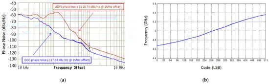 In recent years, frequency synthesizers are developing very swiftly. An all-digital frequency synthesizer has no passive elements such as resistors and capacitors in the loop filter, and it is easy to redesign with process evolutions. It operates in the digital domain, and the passive loop filter is displaced by the digital loop filter. Therefore, it eliminates the need for large area consumption and reduces the noise interference. Several studies of designing PLLs in 5.2 GHz band in recent years are found [,]. Literature [] achieves good phase noise performance, but the tuning range is only 200 MHz and the settling time is long, about 51 μs. The author used a DAC to reduce the mismatch [] for frequency synthesizer. Although the proposed technique reduces the phase noise effectively, the calibration circuits consume a large chip area and high-power consumption [,]. Literature [] adopts current compensation technique and achieves better phase noise, but it needs a long settling time. Phase noise is highly important to the design of a frequency synthesizer. In order to reduce the reference spur, this proposed prototype adopts a phase detector, which delivers phase error raw data only as phase error is investigated. The phase error between the input reference clock and the feedback clock is found by the phase frequency detector (PFD), is executed by the time-to-digital converter (TDC) and is sent to the digital loop filter to control the digital-controlled oscillator (DCO) of each reference clock. When phase error is detected and revises DCO control codes at each reference clock period, the reference spur is reduced. The reference spurs are measured according to the difference in power between the carrier and the spurs at a set frequency offset given in dBc, as shown in Figure 1a []. A novel random clock generator is presented to perform the random selection of the phase frequency detector control for the charge pump in a locked state. The proposed all-digital frequency synthesizer is fabricated in the TSMC 0.18 μm CMOS process. For radar equipped applications and radar-communication control, measured results achieve a locked phase noise of −110.74 dBc/Hz at 1 MHz offset frequency, a power dissipation of 16.2 mW from 1.8 V souring voltage and a chip size of 0.842 mm2.