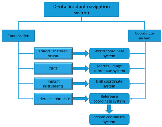 The scheme of the dental implant navigation system (DINS) is based on trinocular stereo vision (TSV).