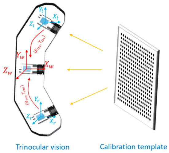 The 3D information of markers is obtained by TSV through the aerial triangulation method. The mathematical model of TSV is obtained by calibration. Compared with single camera calibration, TSV calibration aims to unify three cameras to the same coordinate system, called the world coordinate system. In this study, the world coordinate system is unified into the same coordinate system as the medium camera, whose origin has been set to its optical centre. The schematic diagram is shown in Figure 3.