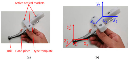 In dental implant surgery, a variety of implant surgical instruments are used to drill holes in the edentulous area. In this study, a T-type template with three active optical markers is installed on a commonly used implant hand piece. Structures of the self-designed implant instrument are shown in Figure 5a.