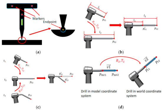 - A long ball drill is installed on the self-designed implant instrument, and the effective length of the drill is recorded. The second calibration is also completed by using the calibration method in Section 2.3.1. Recorded data include endpoint coordinate and marker coordinates at time .