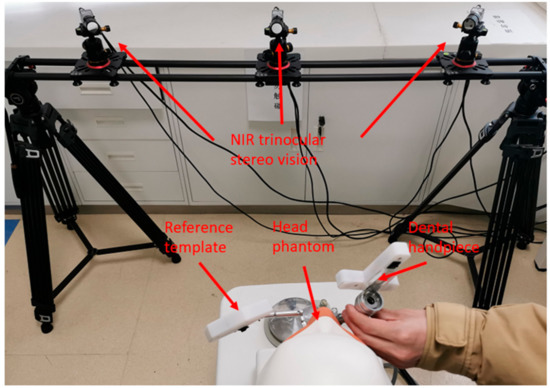 Implant hole preparation experiments are carried out using self-designed DINS. The phantom jaws are used to explore the feasibility of the system and the precision of implant holes. The system setup is shown in Figure 8. Then, 850 nm near-infrared (NIR) filters are employed to eliminate ambient light interference, and three Basler AcA2000-165μmNIR CMOS cameras, NIR enhanced, are used for pleasurable image quality in the NIR band. The resolution (H x V) is 2048 pixels × 1088 pixels. As an NIR trinocular stereo vision system is constructed, the effective field of view is determined accordingly. The effective field is a maximum of 824 mm in the width direction, 437 mm in the short transverse direction, and 540–1380 mm in the depth direction.