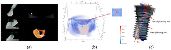 Figure 9. Image data processing. (a) Ideal implant is designed, (b) positioning markers are extracted, (c) comparison between the actual trajectory and the planned trajectory, An represents angle deviation, En represents entry deviation, Ex represents exit deviation. - (3)