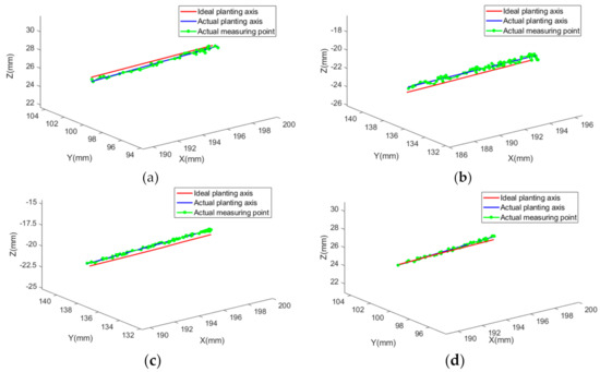 The ideal implanting axis and the actual implanting axis are mapped to the same coordinate system by registration. The measured points on the axis of the borehole and the ideal implanting axis are shown in Figure 11. The red lines are the coordinates mapped from the ideal implanting axis to the world coordinate system, the green points are the actual measuring points of the boreholes, and the blue lines are the actual implanting axis fitted based on the measuring points. It can be seen from the figure that distances (less than 1 mm) between the actual implant axis and the ideal implant axis meet the demands of dental implants.