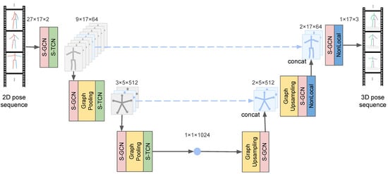U-Net structure [18] extracts different resolutions to capture visual patterns or semantics to improve the algorithm performance, and has been successfully applied in many fields such as semantic segmentation, image compression, and denoising. U-Net performs bottom-up processing through the upsampling of feature maps, combined with the underlying high-resolution features, such as the method proposed in the superimposed hourglass network for 2D pose estimation. This U-Net structure only handles different resolutions in the spatial dimension, but cannot handle spatio-temporal information. Inspired by this, as shown in Figure 1, we extend this structure and propose a U-Net structural model scheme for spatio-temporal information. Its purpose is to learn temporal and spatial semantic fusion features for 3D human pose estimation. The data flow is bottom-up, where 2D keypoints are fed into the proposed network and 3D pose estimates are then generated as output.