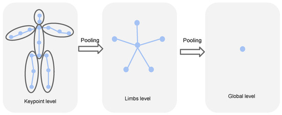 As shown in Figure 4, we divide the body key point nodes into five subsets according to the characteristics of the skeleton structure, and then perform a maximum pooling operation on each subset. Next, the coarsened graph is maximally assembled into a node that contains global information for the entire skeleton. In this process, the skeleton space structure is gradually fused and connected with the corresponding decoded layer in the skip connection of U-Net. Vertex features in the graph of the same granularity are assigned to corresponding vertices in the graph during the upsampling process to fully preserve local spatio-temporal features.
