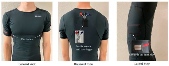 Sportswear-type wearable examined in this study. ECG electrodes are located under each armpit, and the inertial sensor embedded into the data logger is mounted on the upper back.
