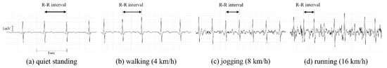 ECG waveforms recorded by the sportswear-type wearable: (a) at rest (quiet standing); (b) walking; (c) jogging; (d) running.