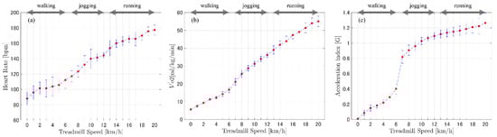 Mean and standard deviation of (a) heart rate (bpm), (b) oxygen uptake (), and (c) acceleration index at each treadmill speed across all participants.