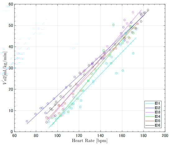 Regression lines of the heart rate and oxygen uptake comparison of all participants. All participants showed a linear relationship with small variations (r ≥ 0.96).