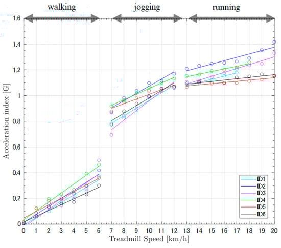 Regression lines of the acceleration index and treadmill speed comparison of all participants. All participants showed linear trends between acceleration index and treadmill speed within each condition: walking (0–6 km/h); jogging (7–12 km/h); and running (13–20 km/h).