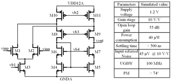 The CTIA in the sensor is the key to improving the threshold uniformity of the readout clusters. A folded-cascode amplifier is chosen as the CTIA’s amplifier in consideration of the 1.2 V power supply. The schematic of the amplifier is shown in Figure 4. This sensor’s high frame rate requires the amplifier to operate at a high unity-gain bandwidth (UGBW) of 100 MHz, to realize a settling time less than 500 ns. This specification leads to high power consumption. While the pipeline operation scheme is applied to reduce power consumption, the amplifier still consumes 40 μW.