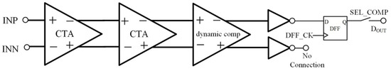 Figure 5 shows the diagram of the 1-bit quantizer, composed of two CTAs, a dynamic comparator, two inverters, a D flip-flop (DFF) and a switch. INP and INN are the two inputs to the 1-bit quantizer from the CDS block. A two-stage cascode CTA operates as the preamplifier of the dynamic comparator. This 1-bit quantizer determines whether there is at least one photon hitting the jot or not by comparing INP and INN. Ideally, the threshold voltage of the 1-bit quantizer is 0 V. However, due to the offset contributed by the CTAs and comparator, it is slightly deviated from zero and needs to be designed as small as possible to reduce the probability of false conversion [12].