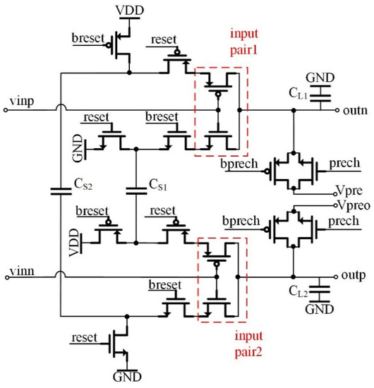 Figure 6 shows the schematic of the CTA, which is designed based on the previous design [7], except for a lower power supply. Vpre and Vpreo are two reference voltages. The gain of the CTA is mainly determined by the ratio of the sampling capacitor, CS, and load capacitor, CL, which mostly comes from the gate capacitor of the next-stage’s input transistors. To adjust the threshold of the quantizer, Vpre and Vpreo of the second CTA are set to be different. Vpre and Vpreo of the first stage CTA are fixed to be the same in the sensor. This not only adjusts the threshold of the quantizer but also helps overcome the offset contributed by the dynamic comparator as well as the CTA. The random offsets of the 1-bit quantizers in different readout clusters still need to be minimized. This is because they also degrade the uniformity of the whole readout circuits.