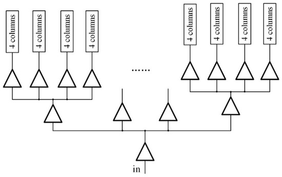 Figure 7 shows the distribution of the clock tree. Each buffer at the end point drives four columns, or 64 (16 × 4) readout clusters in total. The propagation delay caused by this architecture is 100 times smaller than the simple clock buffer driving all columns, which usually needs to drive more than 1000 columns. In addition, it is more difficult to synchronize the timing signals for the first and last columns for simple clock driver than for clock tree driver.