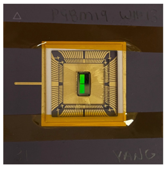 The single-bit QIS was fabricated in a TSMC 45 nm/65 nm stacked BSI CIS process and the chip area is 6 mm × 3 mm. A photo of the packaged die is shown in Figure 9.