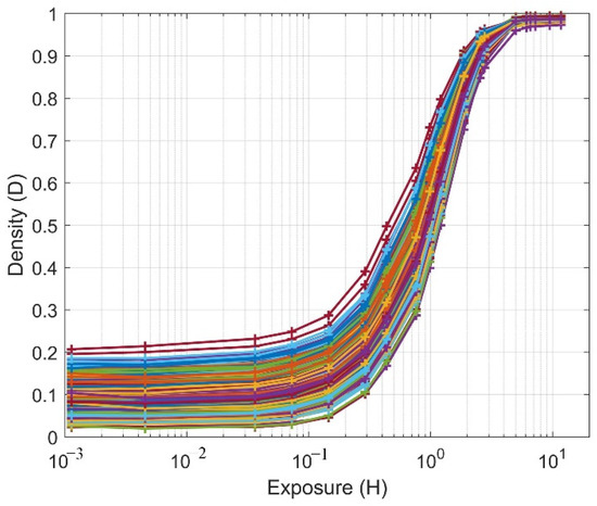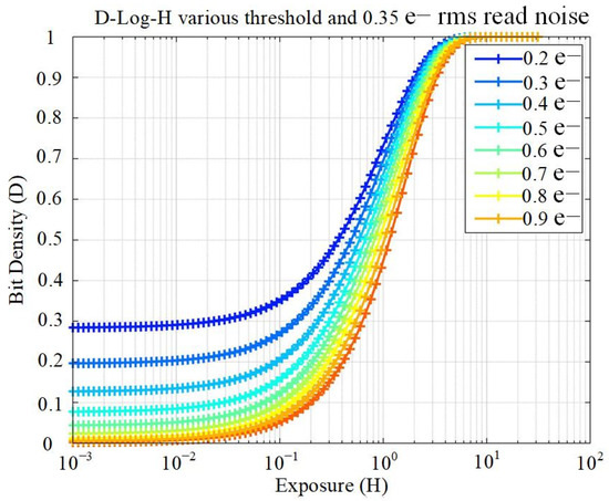 The D-log-H characteristic of a single-bit QIS is a useful tool for evaluating uniformity as well as proving true single-electron sensitivity. Figure 11 shows the theoretical D-log-H for a single-bit QIS with 0.35 e− rms read noise and various quantizer threshold levels [15]. The distribution becomes narrower and bit density smaller at lower exposures with higher threshold. If the threshold uniformity across all readout clusters is good, the spread of all clusters’ D-log-H curves is narrow. For the D-log-H characteristics of a readout cluster with a fixed quantizer threshold, the read noise would cause an increase to the bit density in low light levels.