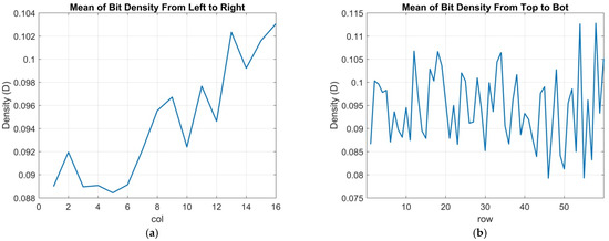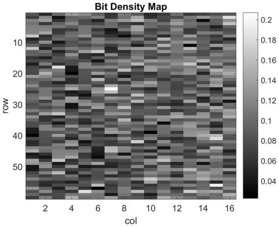 The threshold uniformity of the whole array, D-log-H curves from the 2Mjot sensor for all 1024 readout clusters, were measured and are depicted in Figure 12. To estimate the thresholds of the different clusters, Figure 12 is compared with the theoretical D-log-H curves with 0.35 e− read noise, and the range of all clusters’ thresholds is from 0.3 to 0.8 e−. To show the variation of all clusters more clearly, Figure 13 shows a map of all cluster bit densities at the H = 10−3 of the D-log-H curves. From the figure, no clear trend can be found, meaning that the variation for all clusters is uniform. Then, to analyze the uniformity quantitatively, the bit density average of each column and row are both calculated as shown in Figure 14. A trend can be seen for column average in Figure 14a while still no trend is shown for row average. There are some possible reasons: the nonuniform distribution of oxide thickness, the timing delay and the IR drop across the whole array. The most probable one is the distribution of three CTIA power supply pads, located at the top, left and bottom of the cluster’s array.