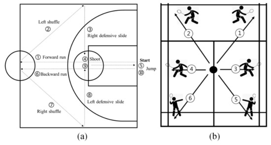 Custom basketball exercise routine (a) and badminton six-point footwork (b).