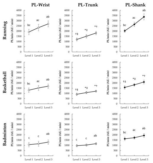 Change of PL/min among three exercise intensity levels under different sports (n = 14). Bonferroni post hoc test: significantly different than a Level 1, b Level 2, and c Level 3 (p < 0.05); Wilcoxon signed rank test: significantly different than * Level 1, † Level 2, and ‡ Level 3 (p < 0.05).
