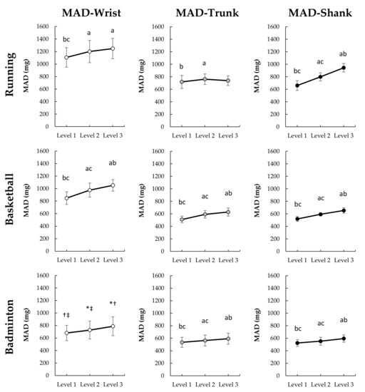 Change of MAD among three exercise intensity levels under different sports (n = 14). Bonferroni post hoc test: significantly different than a Level 1, b Level 2, and c Level 3 (p < 0.05); Wilcoxon signed rank test: significantly different than * Level 1, † Level 2, and ‡ Level 3 (p < 0.05).