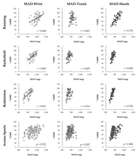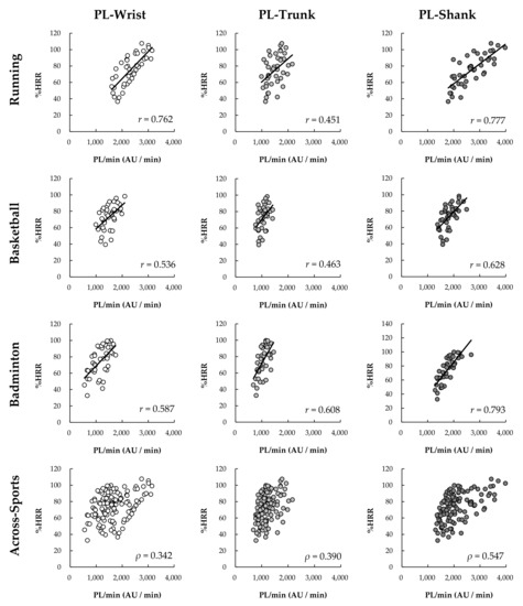 The results of within-sport correlation (Figure 6 and Figure 7) showed that PL and MAD at the wrist, trunk, and shank under three sports were significantly related to %HRR (r = 0.192–0.793, p < 0.05), except to the MAD at the trunk under running (r = 0.065, p = 0.684). The across-sports correlation results showed that PL and MAD at all sensor-placements were weak to moderate related to HR (ρ = 0.207–547, p < 0.05).