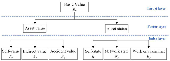 The ICS is a part of the company’s fixed assets, and its security will affect the value of the company’s fixed assets. We use the analytic hierarchy process to evaluate the basic value of ICS. The basic value, , is used to assess the economic value of ICS. The basic value is divided into three layers: target layer, factor layer, and index layer, shown in Figure 1.