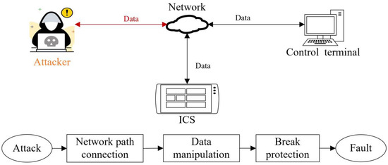 The vulnerability of ICS refers to the system’s weakness that attackers can abstract [37]. When the vulnerability of an ICS is attacked, a basic attack path model should be shown in Figure 2. The attack is achieved through three steps: network path connection, data manipulation, and breaking through protection. The first step ensures that the attacker can connect to ICS through the network. The second step is that the attacker sends malicious attack instructions when the attacker could imitate external communication data of ICS. The third step hides or floods attack instructions so that the instructions can pass through the protection. The attack instructions could steal, change, or delete the system’s data. Moreover, the attack may cause the system’s faults.