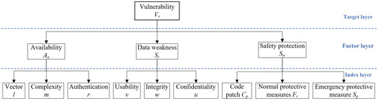 The vulnerability of ICS can be illustrated from three factors depending on the three steps of the attack path model. The three factors are availability , data weakness , and safety protection . Availability means the degree that ICS can achieve specific operations through the network when random attacks are launched. Data weakness evaluates the possibility of communication data being attacked. Security protection is the system’s ability to prevent information attacks. These three factors respectively assess the vulnerability of the three steps of the attack model. Figure 3 shows the hierarchy diagram of vulnerabilities of ICS.