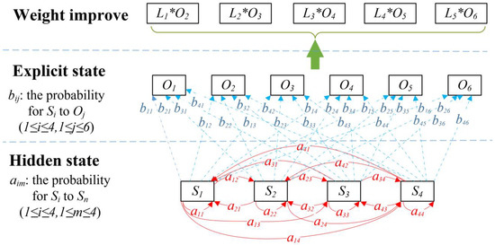 However, HMM cannot distinguish the magnitude of the danger caused by different states. This paper proposes a W-HMM (weight HMM) method. W-HMM is the optimization method of HMM and weighs the results calculated by HMM. The value of weight is estimated based on the magnitude of the danger. The aim is to improve the accuracy of the evaluation when calculating the risk value. In W-HMM, we optimize the calculation of HMM results by weighing the security state. The W-HMM model is proposed, shown in Figure 4.