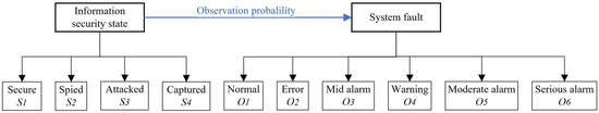 We construct a mapping relation of the Markov process with parameters. The security state can be categorized into secure , monitored , attacked , and captured states. indicates that the system is scanned or spied by an attacker. In this state, the bandwidth resources are occupied, and parameters will be stolen. In the attacked state, the attacker sends malicious data, but the system has not been captured. In the captured state, the system is captured by the attacker to execute the attacker’s instructions. In this state, the system may crash or perform dangerous operations. According to the severity of the fault, system faults are classified into normal , error , mild alarm , and warning ; moderate alarm ; and serious alarm , as shown in Figure 5 and Table 5.