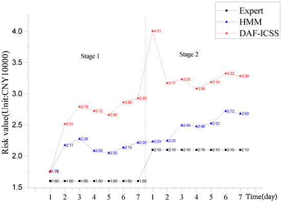 At the beginning of stage 2 in the assessment, we open the UDP port of the system, which leads to a new vulnerability. We increase the weight of Vv, and it results in a severe alarm state. However, the HMM assessment method draws an insensitive rise in Figure 9. Because the HMM method assigns no risk weight to a variety of system security states, DAF-ICSS can sensitively reflect the changes of system risk by weighing the evaluation elements and establishing a dynamic evaluation model. When the system is attacked by a UDP flood, the risk value assessed by DAF-ICSS exceeds CNY 40,000. The values given by other evaluation methods do not exceed CNY 40,000. DAF-ICSS assessment is more accurate than HMM.