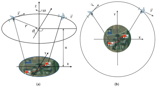 At time , a ground-moving target is located at position . The moving target is assumed to move along a straight line at a constant velocity on flat ground. The velocities of the moving target along the X-Y-Z axis are , , , respectively. Thus, the instantaneous coordinates of the moving target can be written as following [30]: