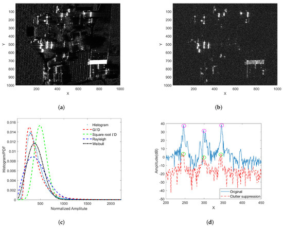 Clutter suppression and the PDF fitted by step II. (a) X-band 0.3 m resolution SAR image; (b) clutter suppression result; (c) PDF fitting result; (d) amplitude before and after clutter suppression: red and green ellipses indicate the amplitude of strong clutter before and after clutter suppression, respectively.