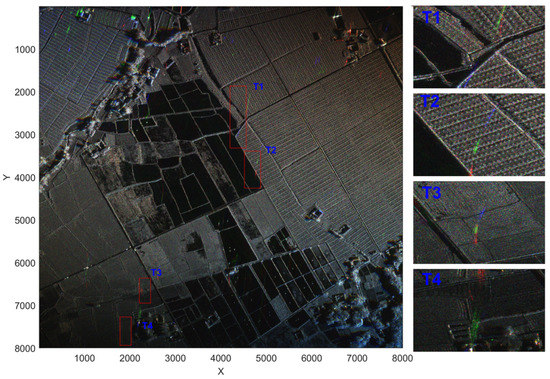 In fact, strong reflectors can be considered isotropic and coherent when the difference in viewing angles is small [5,31,32,33]. In addition, pixels of these static scatterers in the SAR image have the characteristics of large amplitude, continuous distribution, and strong spatial structure. Therefore, we can extract position information of a strong clutter background by using the spatial structure information of strong scatterers and the correlation between multi-angle observations.